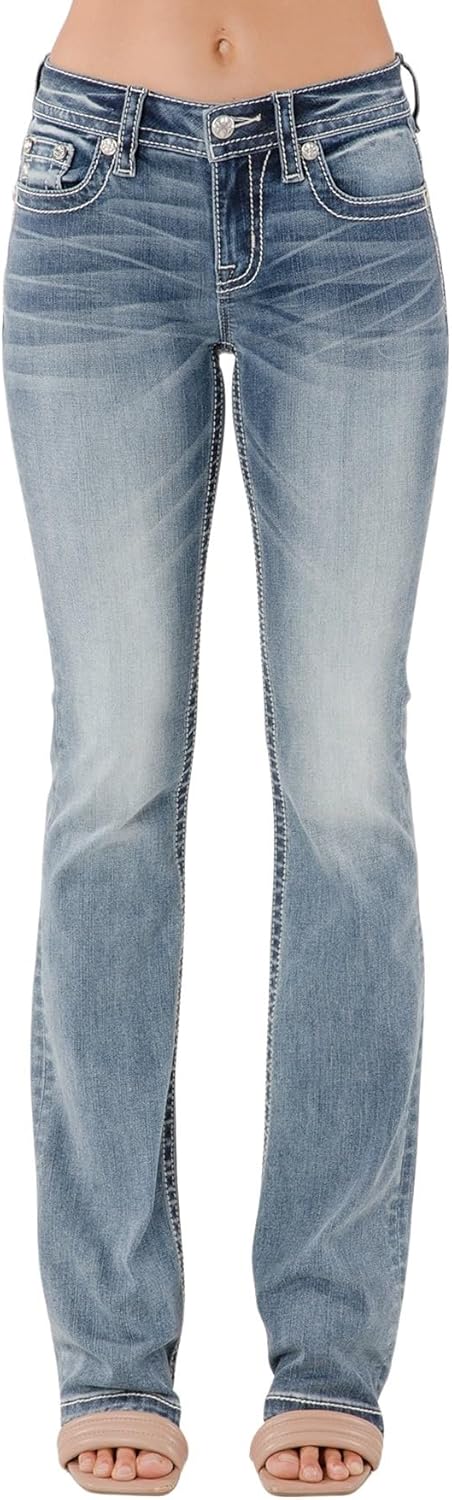 The Miss Me Women's Seren Longhorn Bandana Embellished Pockets Mid-Rise Bootcut Jeans bring a bold Western-inspired touch to your wardrobe with their intricate longhorn embroidery and bandana-style embellishments on the back pockets. Designed in a rich dark wash with subtle whiskering and fading, these jeans offer a stylish, lived-in look that’s both rugged and refined. The classic bootcut silhouette is perfect for pairing with your favorite cowboy boots or heels, making them a versatile choice for any occasion, from a casual day out to a night at the rodeo.Crafted from a premium stretch denim blend, the Miss Me Women's Seren Longhorn Bandana Embellished Pockets Mid-Rise Bootcut Jeans ensure all-day comfort and a flattering fit that moves with you. The mid-rise waist provides the perfect balance of coverage and style, while the five-pocket design enhances both function and fashion. Whether you're embracing your Western roots or simply love a statement piece with unique detailing, these jeans offer the perfect combination of durability, comfort, and standout style.